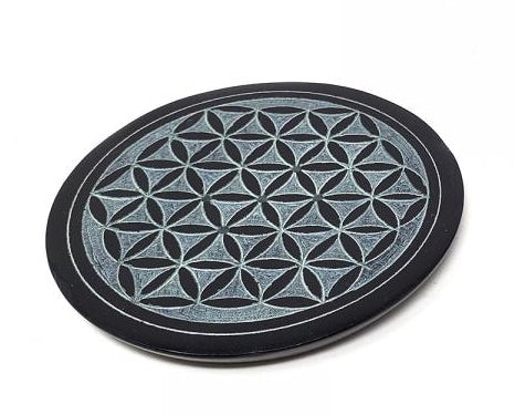 Beautifully carved black soap stone stick burner features the flower of life design. Pattern is such that the hole for the stick really blends in so you could also uses this as an offering plate.