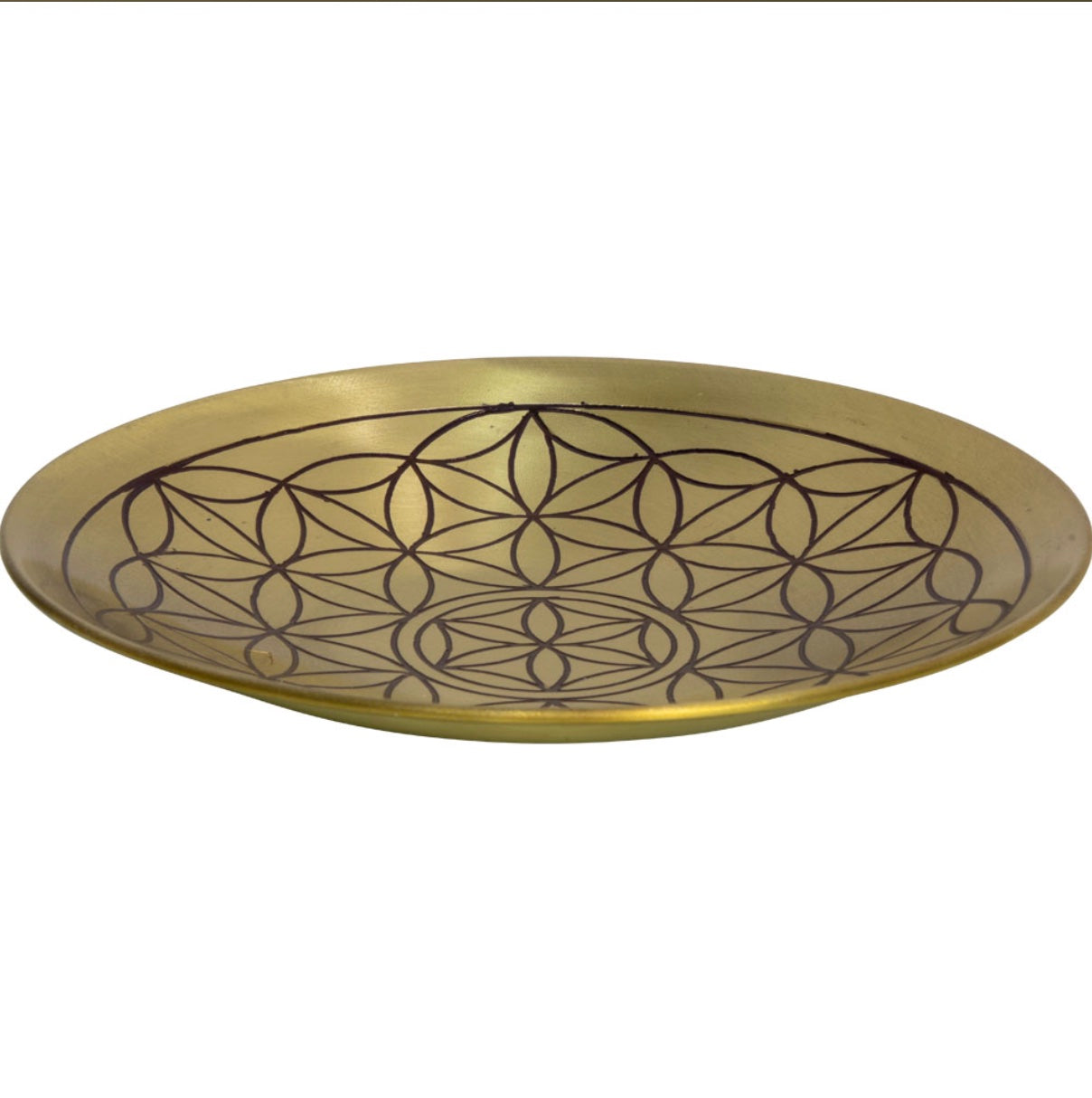 This slightly concave brass bowl is 6" in diameter and is etched with the flower of life pattern.