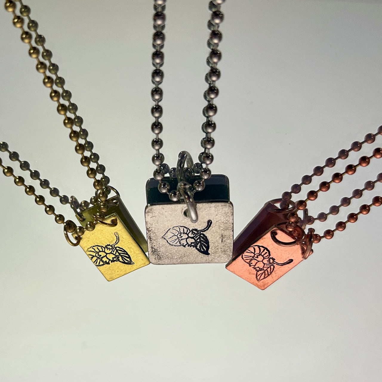Choose from copper, pewter (on stainless steel chain), or Brass.