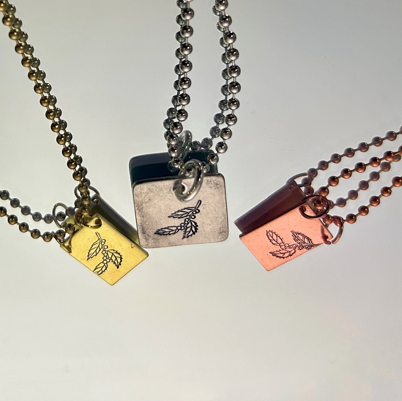 Choose from copper, pewter (on stainless steel chain), or Brass.