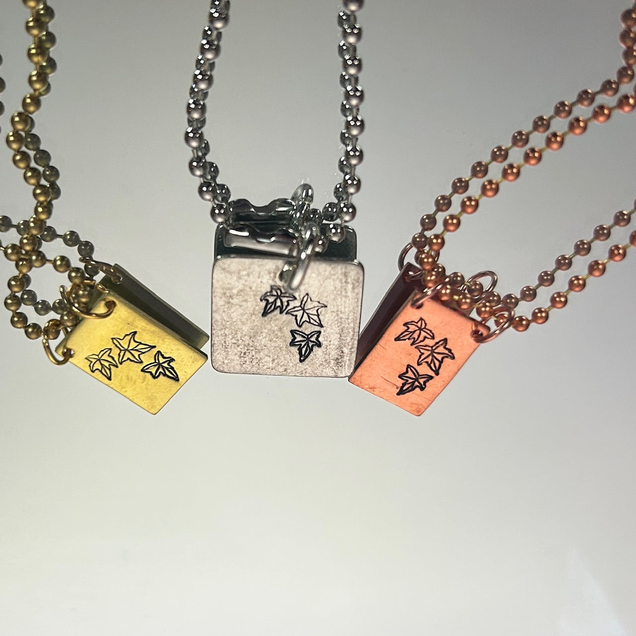Choose from copper, pewter (on stainless steel chain), or Brass.