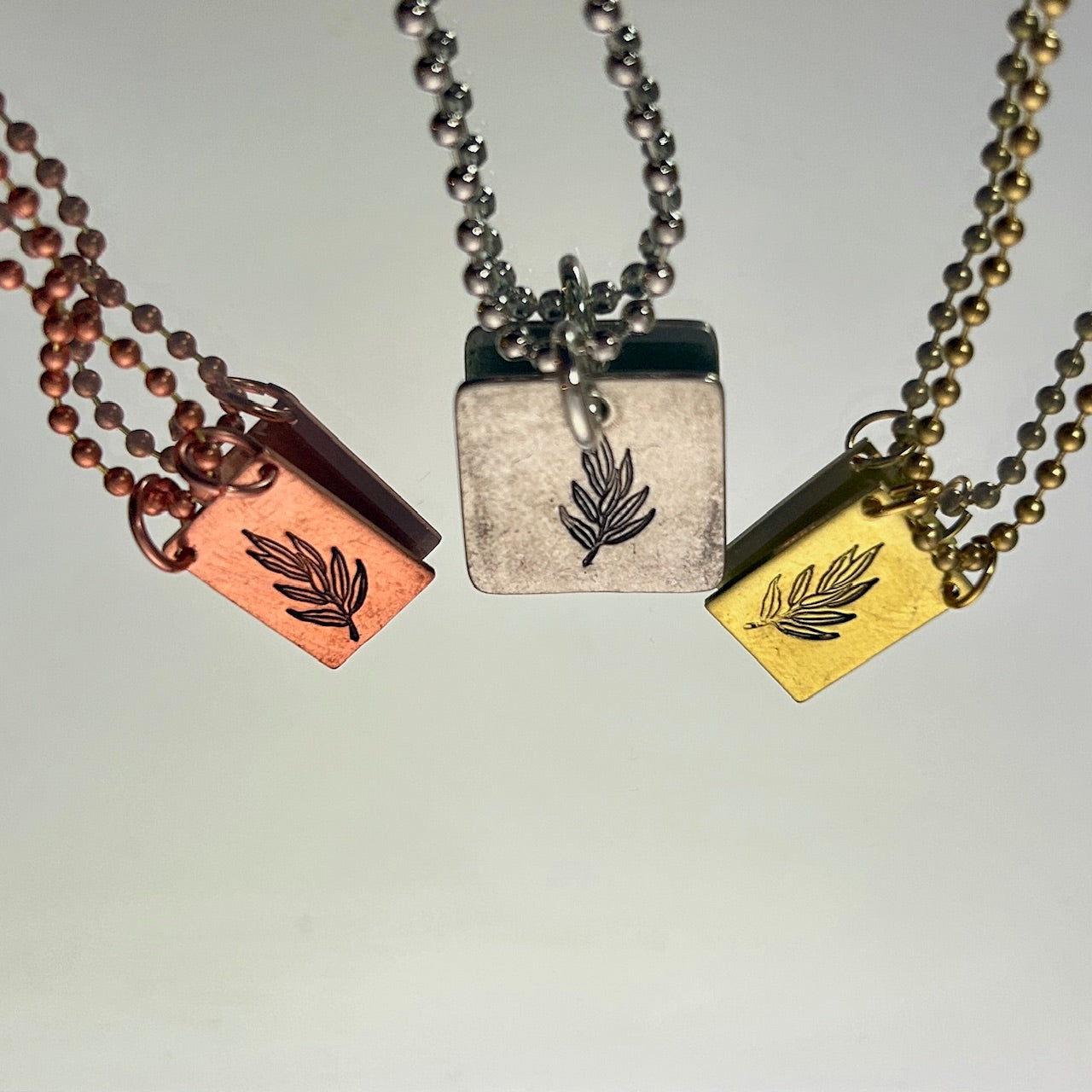 Choose from copper, pewter (on stainless steel chain), or Brass.