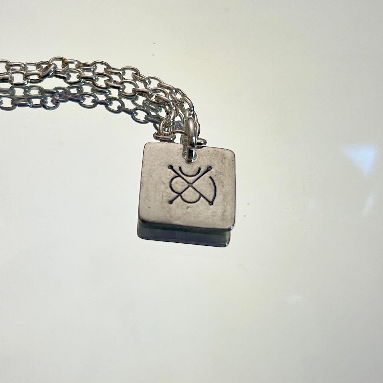 3/4" square perter pendant on a 22" silver tone chain. These are hand stamped pieces and made on demand. The necklace comes in a muslin bag with a card detailing attributes of your design. Please allow up to 3 weeks for fulfillment (especially during holidays).