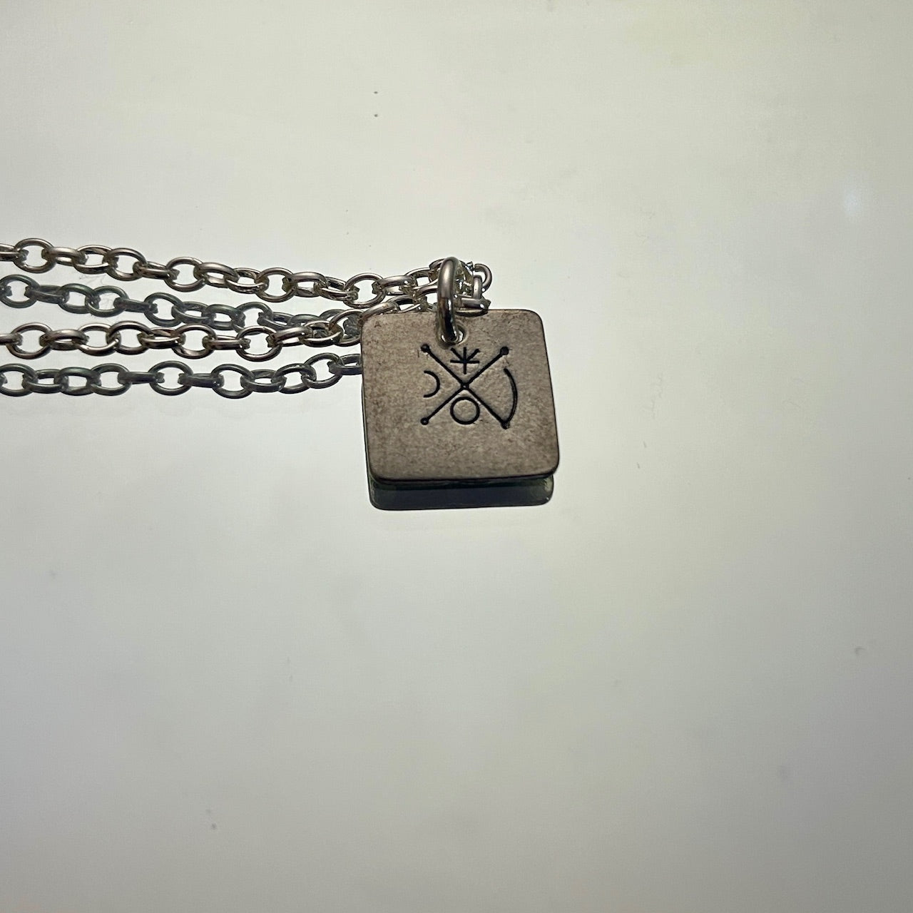 3/4" square perter pendant on a 22" silver tone chain. These are hand stamped pieces and made on demand. The necklace comes in a muslin bag with a card detailing attributes of your design. Please allow up to 3 weeks for fulfillment (especially during holidays).