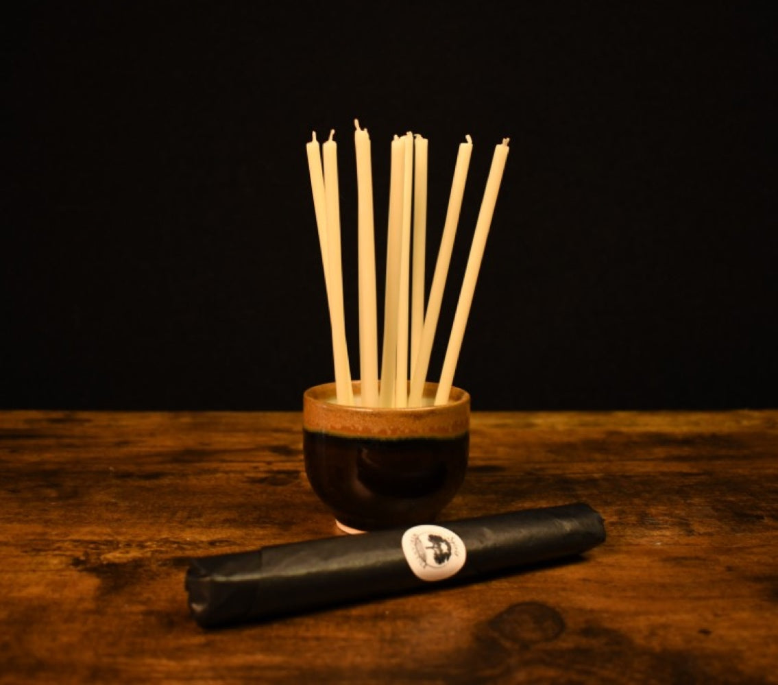 These slender all beeswax candles come from the orthodox traditions of the book. They burn for approximately 30 minutes, providing a natural alternative to the paraffin chime candle. Stick into white sand in a bowl or select one of our wood converters for use with a standard candle holder. 10pk.